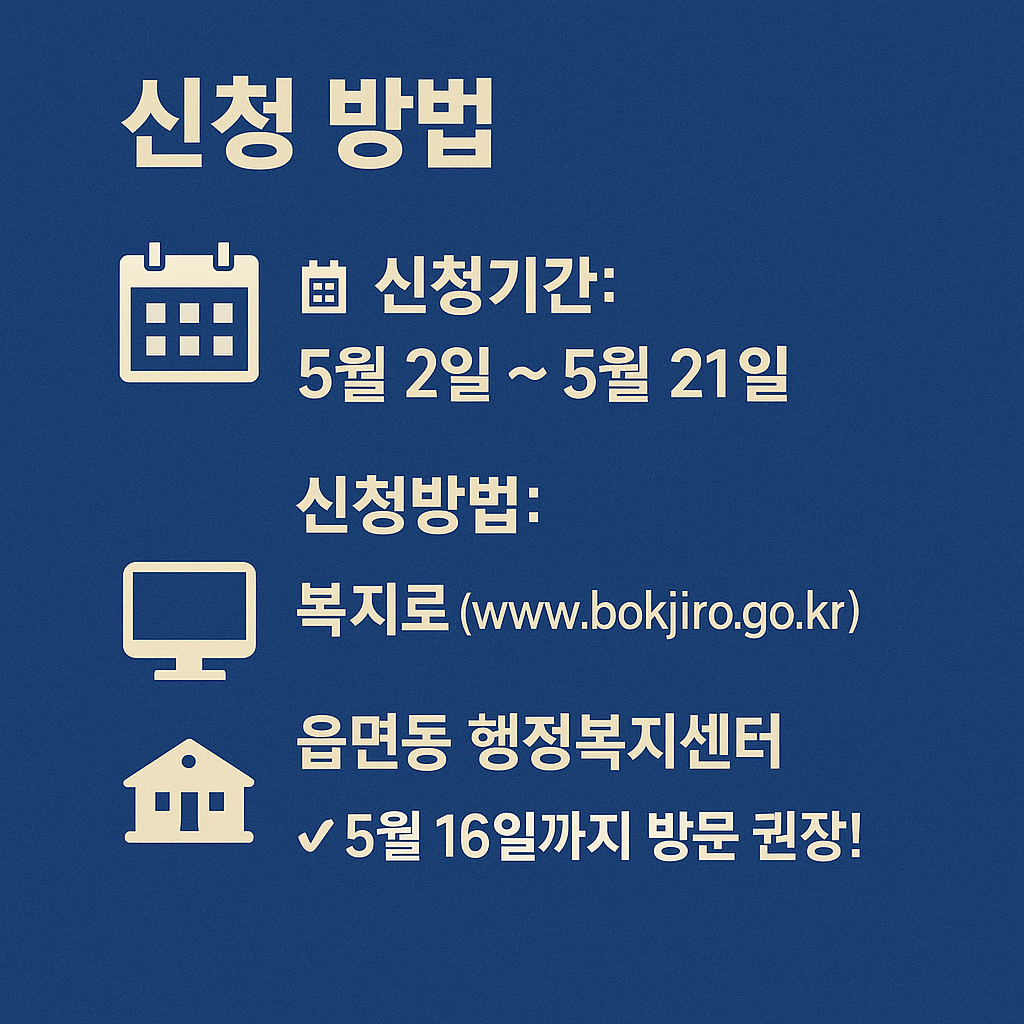 - 온라인 신청 가능 (복지로 포털, 읍면동 행정복지센터)